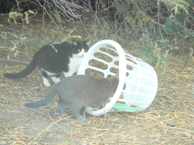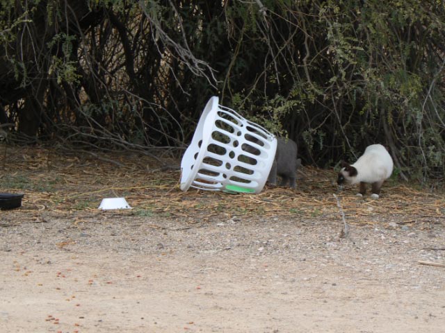 He took the laundry basket, some twine, a bowl of cat food, and determination outside. He tied the twine to the top of my basket and put the food inside. As soon as a cat went in the basket to eat, he would pull it over on him!