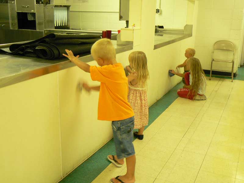 Meanwhile, we worked our tales off at camp, washing the walls and scrubbing sludge off of the floor of the huge dining hall. Even Gabriel and Josie helped. Hanna worked really hard and Naomi also. We actually got a lot done in between driving back and forth to Cody’s camp, swimming, putt putt golf, eating peanut butter and honey sandwiches, and hanging in the motel room.