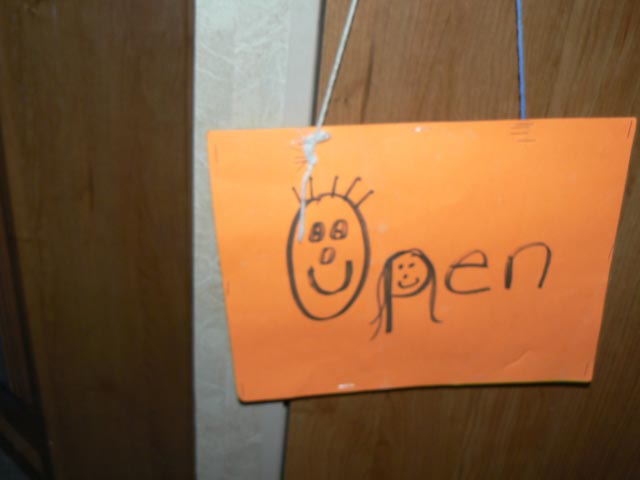 We did put a lock on the inside, up high so the little ones can’t reach it. We have tried signs that say occupied or empty, but they didn’t work, our little ones kept tearing them down.