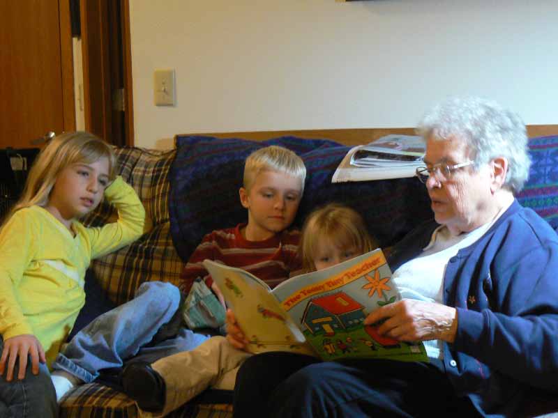 | Great Grandma reading a book to the kids. |
