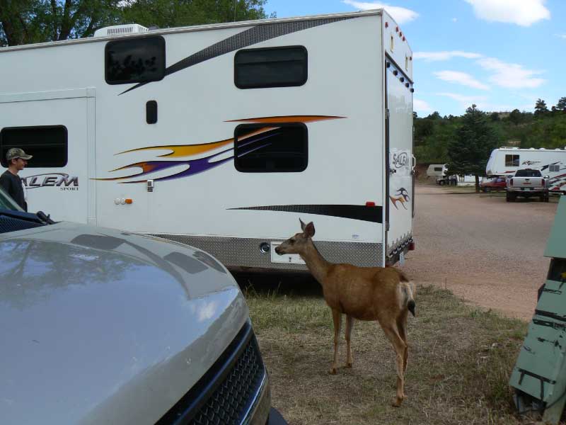While the guys were getting the camper pulled in, the kids and I were at the van. Suddenly, a deer just walked out of the woods and right up to our van! It wanted food! Later we were told the deer there only like potato chips and popcorn. The kids were hilarious as they stood in shock at the deer approaching our van. I know that all wild animals can be dangerous so I told the kids to get to the other side of the van and I politely shooed the deer away. It went around the van and to Cody who loved the visitor.