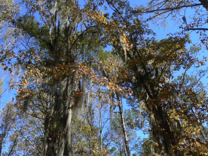 | The Spanish Moss hanging in clumps on the trees around a lake in Montgomery, Alabama. |