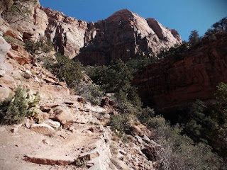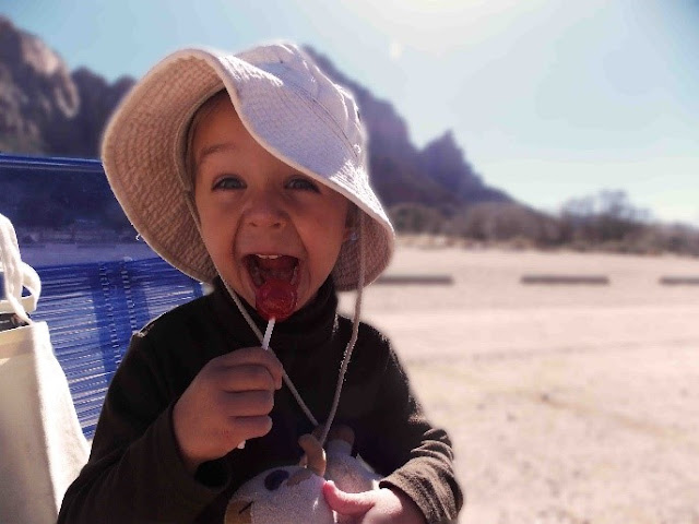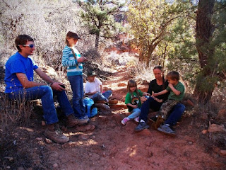 Just like a Dora episode, we went through the brush, up the switchbacks, along the cliff, beside the boulder, under the shade, and past the cactus. Where are we going (clap, clap, clap) – The Loop Trail! Huh? The Loop Trail? When we got to what we thought was the end of the Watchman Trail, we saw a sign that said “The Loop Trail”. So, what the heck, we had already gone this far and figured we might as well do the short Loop Trail. This section of the trail took us out to the point of the plateau we had been hiking up for the past hour and a half. We enjoyed the view and Gabriel (age 8) was so excited that we made it until his older brother told him, “We’re only half way. We have the whole down trip.” So, back down we went, taking a few short breaks along to trail to get a snack, drink some water, and use the restroom behind a tree. And then two other hikers walked past us and said, “Is that your stuffed animal back on the trail?” So, older brother Cody had to run back to save 3 year old Tytus’ PBR bull stuffed animal. It was a near tragedy.