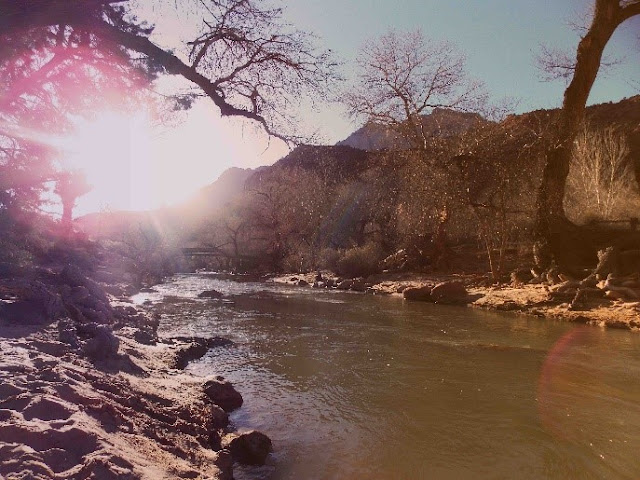 By the time we made it back down to the bottom of the canyon, all the kids had sore legs and were ready to get another granola bar (what did I tell you about snacks?) and sit down for a little while. We made a stop at the van and then walked down the hill from the parking lot to the Virgin River. The kids played in the sand. Josie made a castle and Gabriel poured water in the sand until he made his own canyon. Science in action.