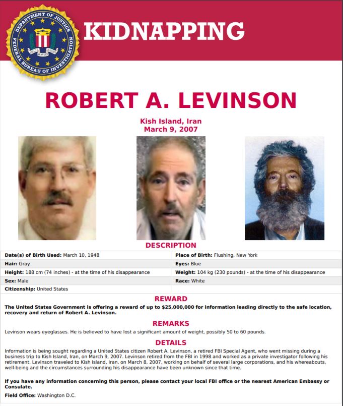 “Information is being sought regarding a United States citizen Robert A. Levinson, a retired FBI Special Agent, who went missing during a business trip to Kish Island, Iran, on March 9, 2007. Levinson retired from the FBI in 1998 and worked as a private investigator following his retirement. Levinson traveled to Kish Island, Iran, on March 8, 2007, working on behalf of several large corporations, and his whereabouts, well-being and the circumstances surrounding his disappearance have been unknown since that time.”