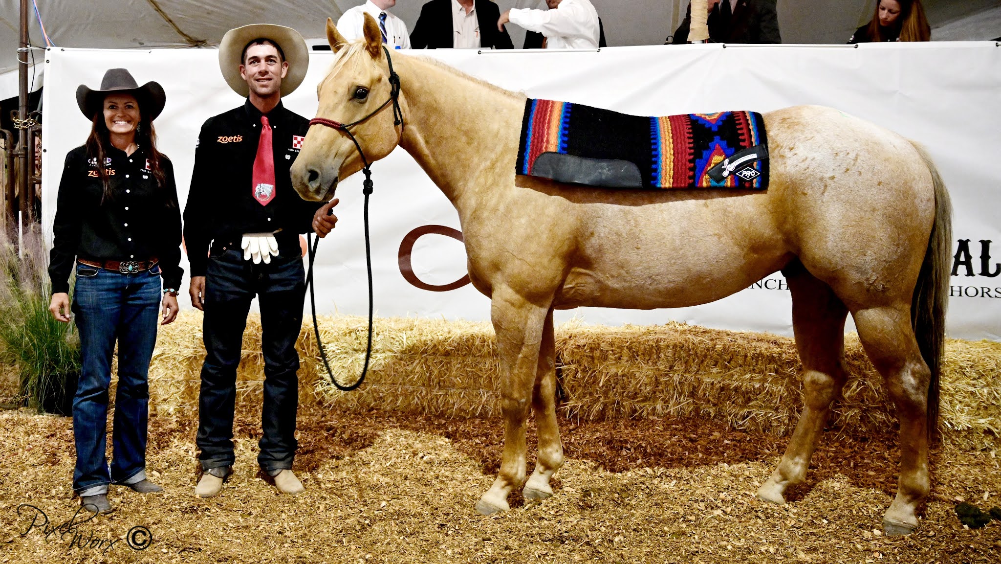 | Sale manager Sarah Kieckhefer and Bret Davis of the K4 Ranch hold 4-year-old high seller Blaze N Glory Booger PHOTO CREDIT: Legacy Ranch Horse Sale |